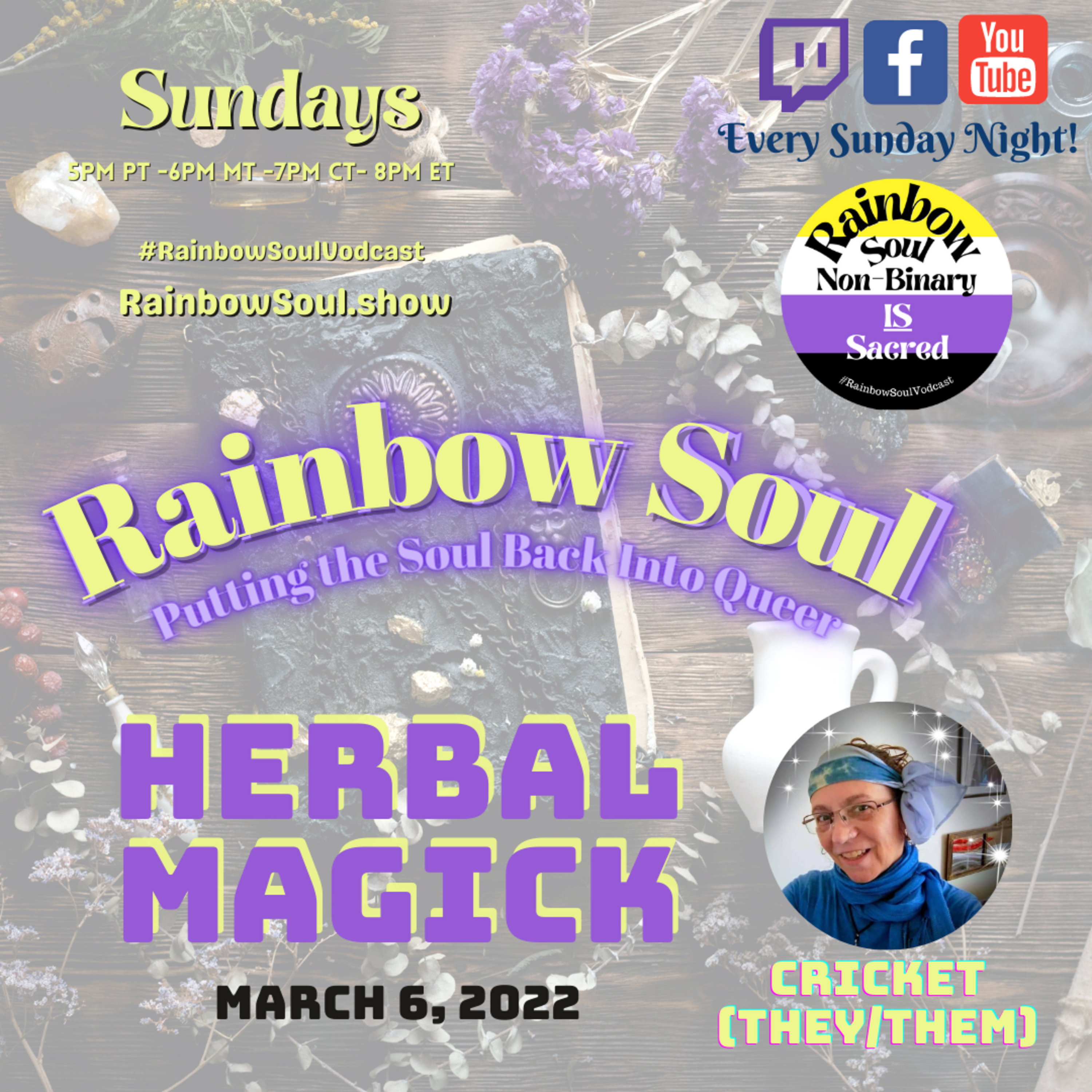 Join Rainbow Soul with Cricket to chat about the herbal magick in herbs! Learn about how you can use herbs, how to prepare them and more! Bring your questions!