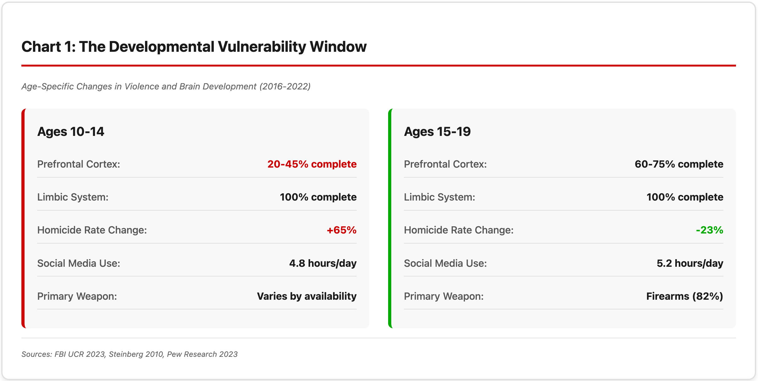 By age fifteen, the prefrontal cortex has developed enough to provide what researchers call âcognitive braking power.â Not enough to fully resist social mediaâs manipulation, but sufficient to pause before acting on violent impulses. This age-specific pattern appears globally. In the UK, knife murders by children under 15 increased 93% between 2014-2019, while the 15-17 age group saw only a 12% increase^[11].
