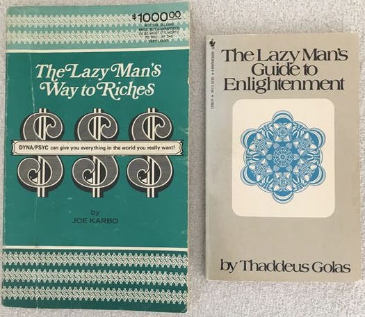 In Ernie’s post in the Book Marketing Success Stories Facebook group, he started by showcasing two books he bought in the early 1970s that got him on the right track in life: The Lazy Man’s Way to Riches by Joe Karbo and The Lazy Man’s Guide to Enlightenment by Thaddeus Golas.