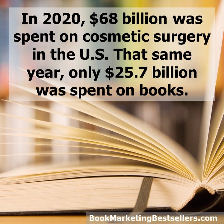 In 2020, almost $68 billion was spent on cosmetic surgery in the U.S. That same year, only $25.7 billion was spent on books.