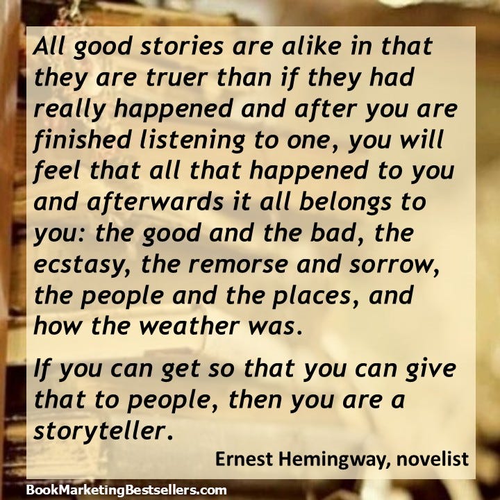 All good stories are alike in that they are truer than if they had really happened and after you are finished listening to one, you will feel that all that happened to you and afterwards it all belongs to you: the good and the bad, the ecstasy, the remorse and sorrow, the people and the places, and how the weather was. If you can get so that you can give that to people, then you are a storyteller. — Ernest Hemingway, novelist