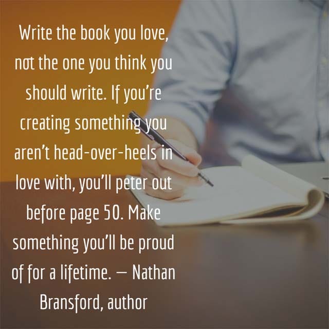 Write the book you love, not the one you think you should write. If you’re creating something you aren’t head-over-heels in love with, you’ll peter out before page 50. Make something you’ll be proud of for a lifetime. — Nathan Bransford, author