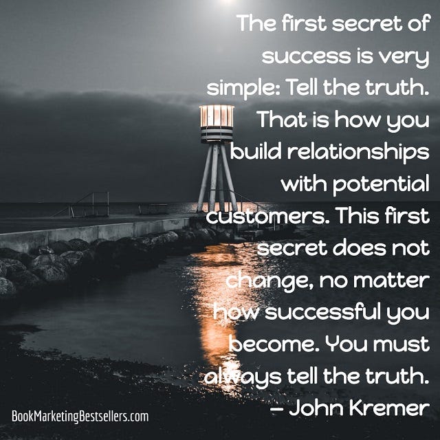 The first secret of success is very simple: Tell the truth. That is how you build relationships with potential customers. This first secret does not change, no matter how successful you become. You must always tell the truth. — John Kremer, author of 1001 Ways to Market Your Books