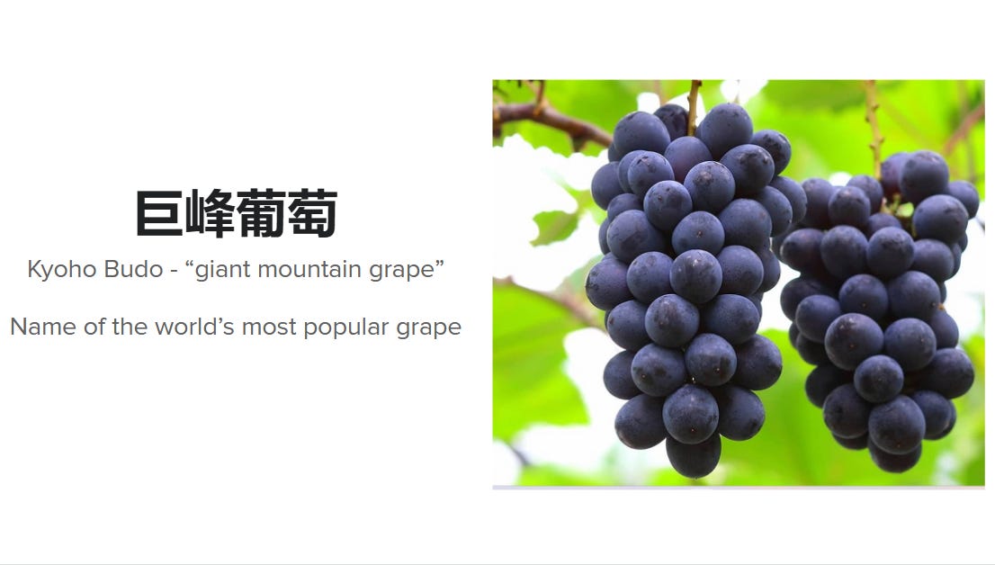 So I changed the entry about Kyoho to read: “Kyoho grapes (巨峰葡萄, Kyohō budō; lit. 'giant mountain grape'") are the most planted grapes in the world by area.[citation added] They are a variety of hybrid grape popular in East Asia.” Isn’t that a more accurate, helpful, and unbiased introduction to a grape you might be trying to learn more about?