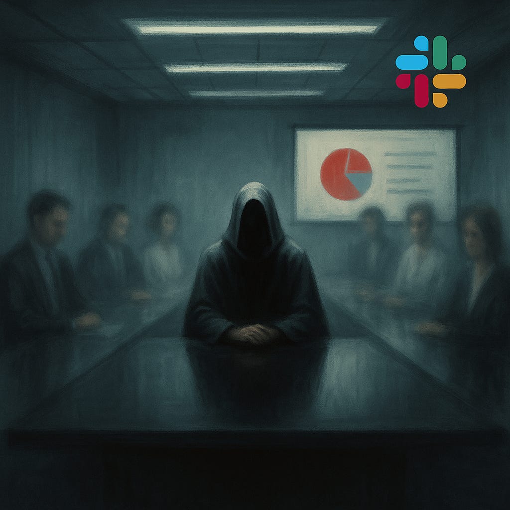 SURROUNDING VOICES: A Greek chorus of Slack notifications and HR Policy PDFs.