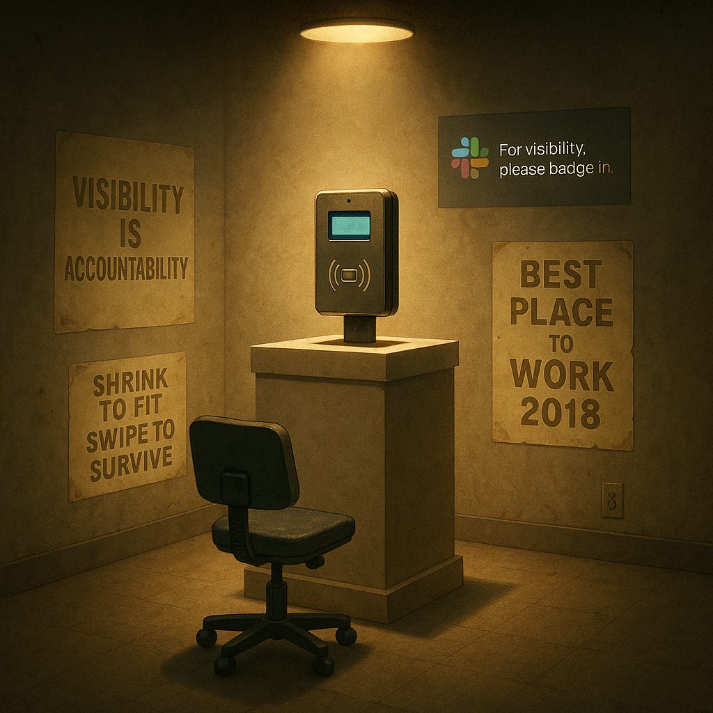 Some found freedom in remote-first startups, where output finally mattered more than optics.Others stayed—shrinking to fit, badging in, badging out, and scanning their way through one “visibility initiative” after another, haunted by the memory of that brief, golden age of autonomy.