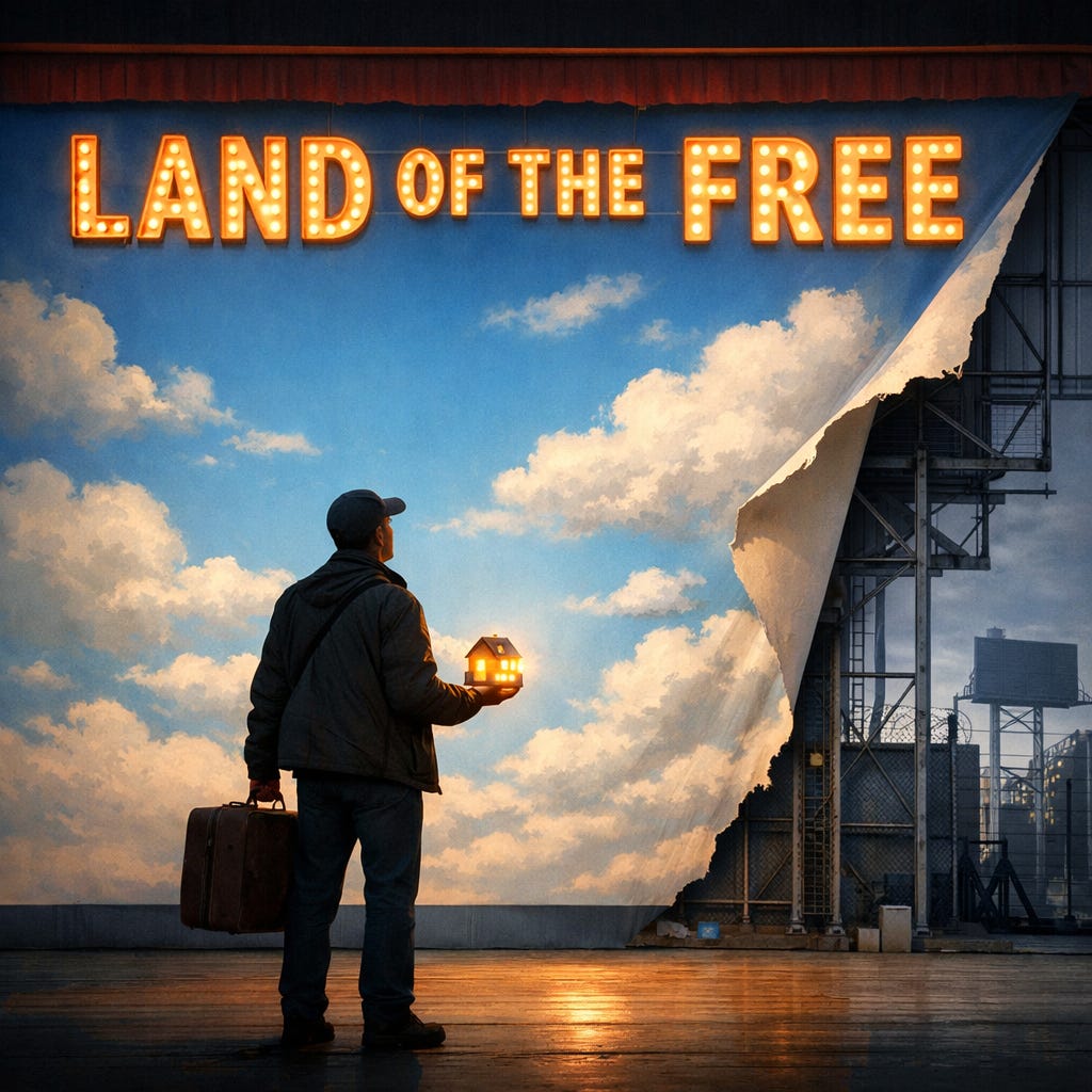 You didn’t come here to hate this place. You came because some mixture of story and necessity brought you: a job, a degree, a war, a passport, a parent, a dream you had no safe place to dream elsewhere. You came through airports and interviews and forms that asked whether you had ever committed genocide, espionage, prostitution, or any other morally dubious activity that wasn’t already in the job description of the United States government. And for a while, you tried to believe the story. You tried to believe that underneath the noise there was a decent country trying its best, that the slogans corresponded to something real: rule of law, equal dignity, a chance. Maybe you even felt it for a time—on a good sidewalk, in a good city, on a good day when the light hit the buildings and your coffee and your salary in the right way.