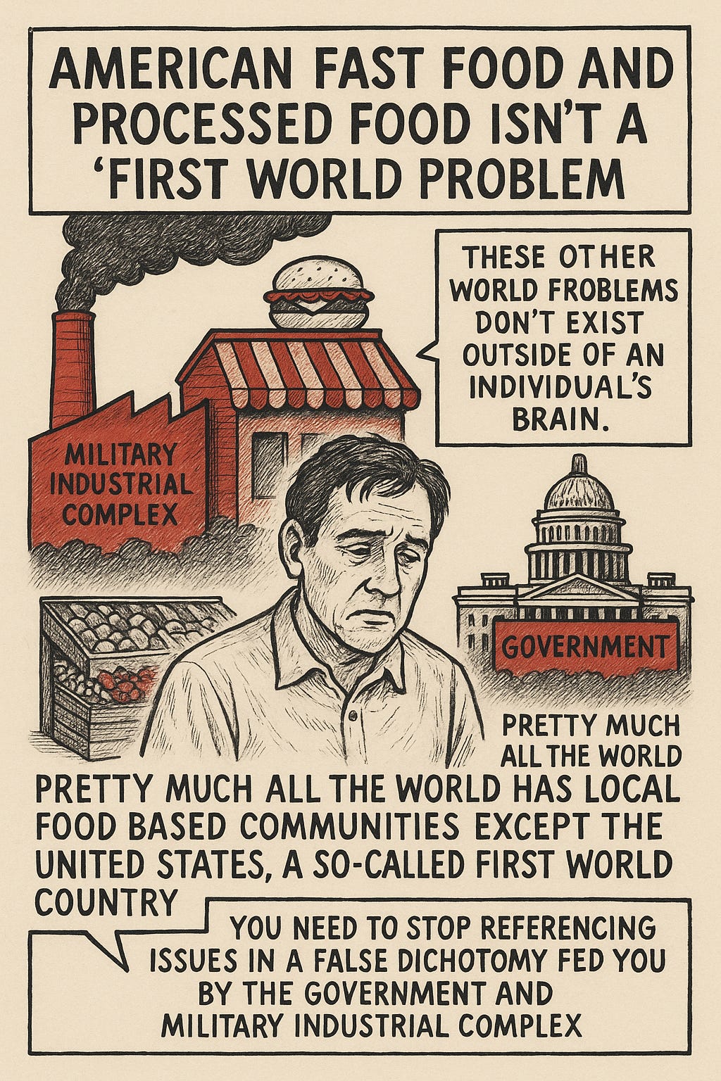 We must retire the phrase—stop apologizing for noticing we are unwell. Start seeing the American condition not as an embarrassing inconvenience, but as an indictment of the systems we’ve been told are modernity’s triumphs.We must rebuild food sovereignty—reclaim localism not as a quaint hobby, but as a radical act of autonomy.We must demand a politics of dignity—one that refuses to rank suffering in colonial terms, and instead centers the human experience over the imperial logic of economic zones.