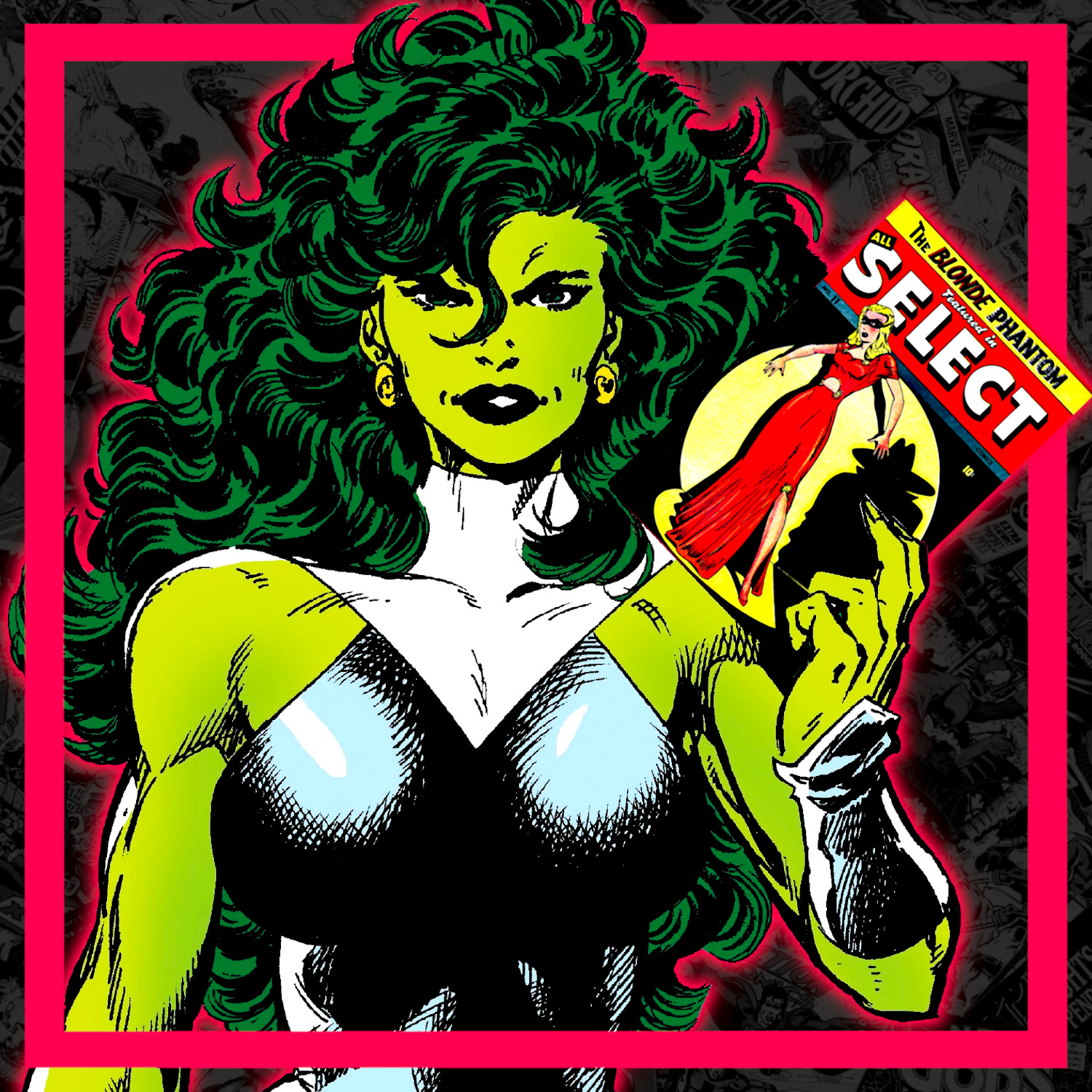 Louise explique à Jennifer que dans les années 1940, elle était Blonde Phantom, une justicière costumée combattant le crime. Blonde Phantom est un vrai personnage de bande dessinée, dont les aventures ont été publiées par Timely Comics, l’ancêtre de Marvel, à partir de 1946. Créée par le scénariste Al Sulman et par le dessinateur Syd Shores à la demande de Stan Lee qui trouvait que les publications Timely manquaient de super-héroïnes, elle fait sa première apparition dans All Select Comics #11, un périodique qui sera d’ailleurs renommé Blonde Phantom dès le numéro suivant. Secrétaire du détective Mark Mason, Louise Grant revêt un loup et une robe de soirée rouge du meilleur effet pour devenir la justicière Blonde Phantom et ainsi aider son patron à résoudre les affaires les plus corsées. Bien que dépourvue de super-pouvoirs, elle combat tour à tour d’anciens nazis, un inventeur monté sur des chaussures à ressorts, un savant fou venu du futur, et même son sosie remodelé par un chirurgienne peu scrupuleuse !