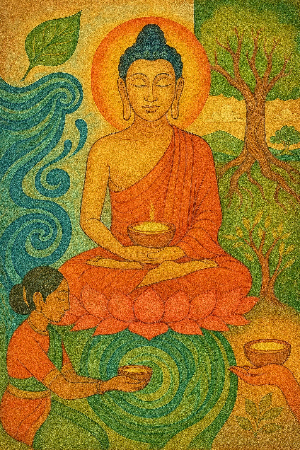 After receiving the kheer and bathing in the river, Siddhartha walked a distance to the “Tree of Awakening,” the Bodhi tree. This shift in location represents a fresh start. He left behind the site of his suffering and the “entanglements” of the Banyan tree to move toward a new space of clarity. Strengthened by Sujata’s kindness, he sat no longer as a man seeking to destroy his body, but as one seeking to understand the world through the balance of the Middle Way. It was here that he achieved enlightenment. Sujata’s story proves that spiritual insight is not found in the rejection of life, but in the compassionate balance of it. Through her offering, the world learned that nourishment is not an obstacle to enlightenment, but a prerequisite for it.