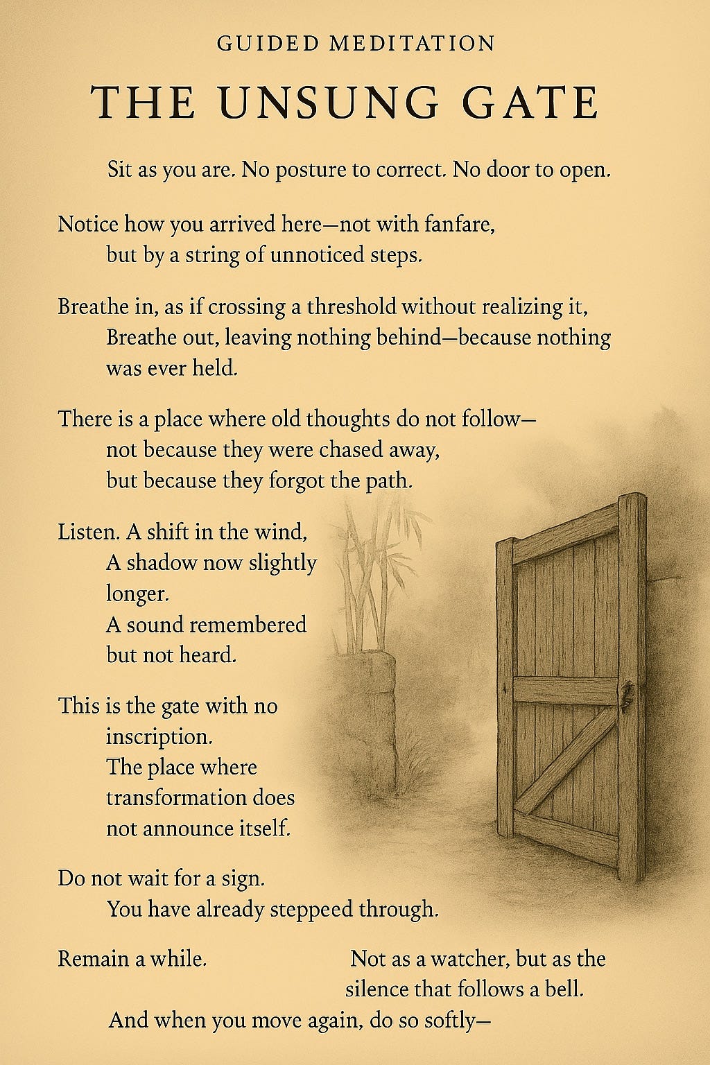 The Unsung Gate beckons - a brief Guided Meditation rooted not in grand transitions, but in quiet thresholds. It honors the subtle shifts: a change in light, a gesture not made, the breath before decision. This is the Dào in its most whispering form.