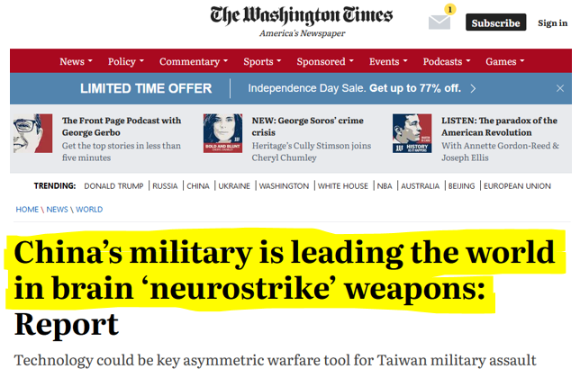 Let me just start out with a brief victory lap here, as it was quite refreshing—and only a little disturbing—to see China leading the world with “brain neurostrike weapons” on the front page of the Washington Times this morning. Thus, the last two reports on psychotronics, psychic warfare, and transforming human consciousness (TR 401 & TR 402) now have their loose counterpart in the mainstream media.