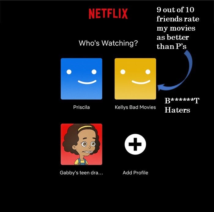 Friends- ‘Kelly’s Bad Movies’ made its appearance on the Netflix account the next day. This month I’ve seen Den of Thieves, Passenger 57, and Extraction. Plus, P seems happy.