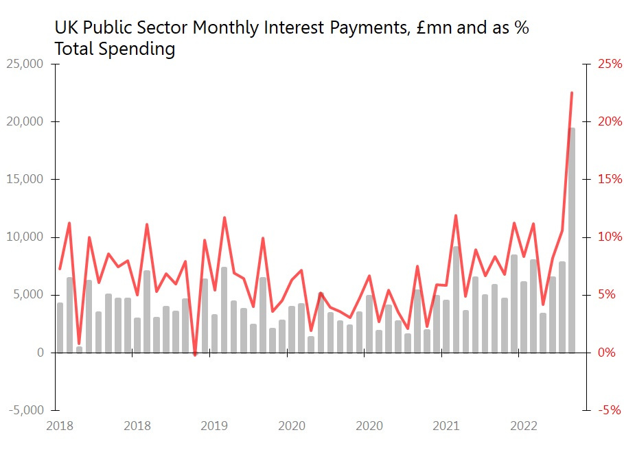 Second thing: today's UK public sector deficit of £22.1bn featured an astonishing £19.9bn in interest payments. That's 23% of total spending, which is 6.2SDs above the long-term average. Cui bono? Why, chancellor Rishi Sunak of course, hoping to step up to become PM on a Treasury-determined manifesto of immediate recession-inducing tax rises. That unprecedented shock of interest payments could almost have been designed to illustrate the Treasury's - sorry, Rishi's - argument. And probably was - 6.2SDs after all.
