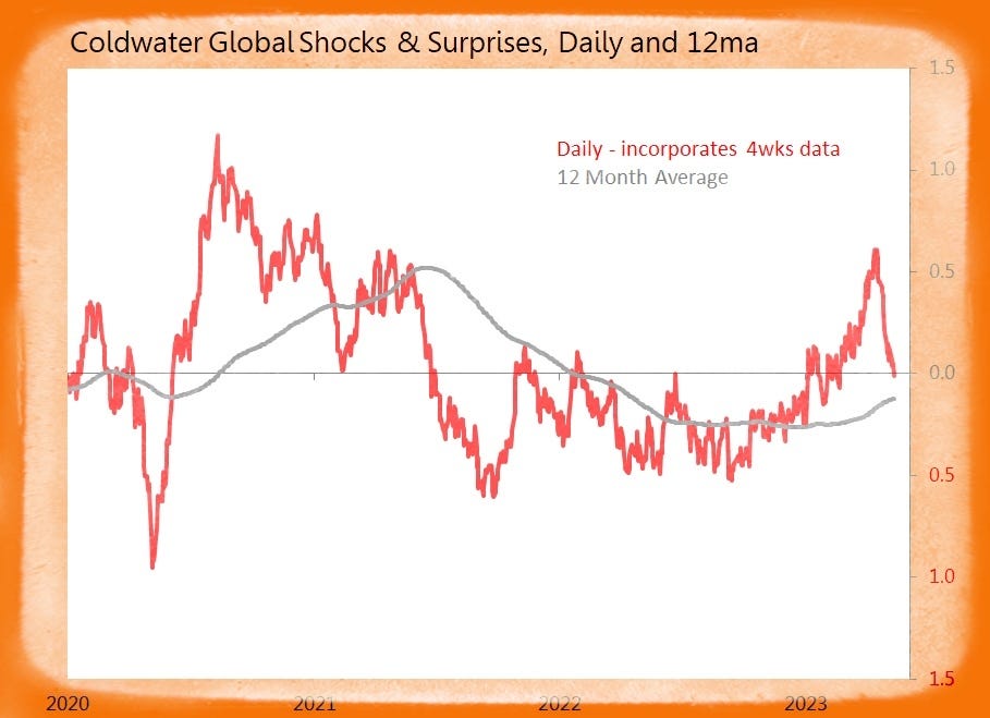 Not a fabulously busy week - only 83 data releases generating 10 surprises but 17 shocks. But those shocks were enough to push the Coldwater global shocks & surprises index into negative territory for the first time since February.