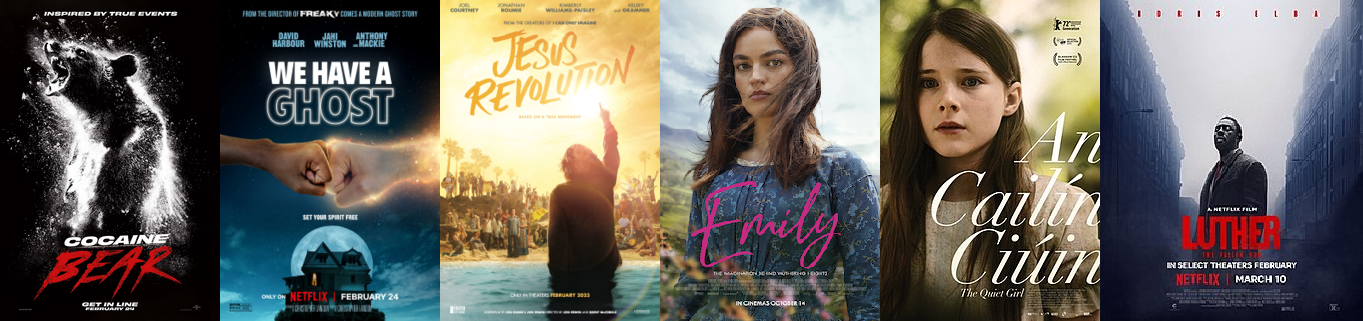Erik Childress and Steve Prokopy look at six new movies this week. They include an acclaimed film from Ireland you may have heard about on our best-of-2022 show (The Quiet Girl) and a feature version of Idris Elba’s BBC series (Luther: The Fallen Sun). The star of Sex Education brings the author of Wuthering Heights to life (Emily) and hippies become Jesus freaks (Jesus Revolution). Finally, David Harbour is a silent apparition in a new family’s home (We Have a Ghost) and you may have heard the one about the bear that did cocaine.