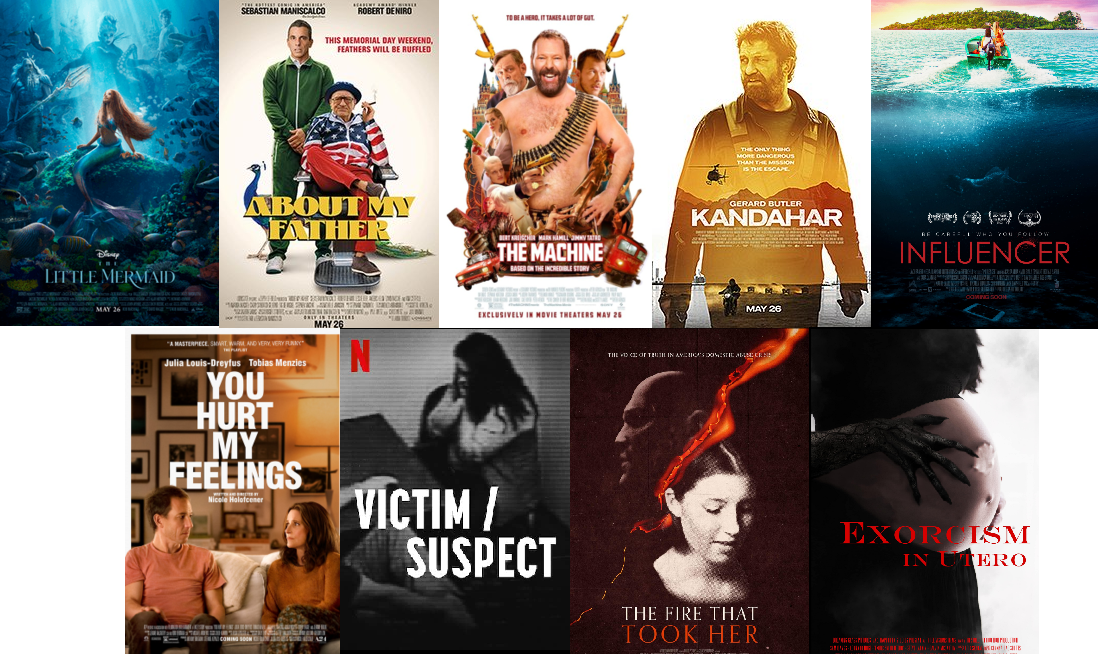 Erik Childress and Steve Prokopy have nine movies to review on the show and the best one may be the one they told you about in January at Sundance from Nicole Holofcener and Julia Louis-Dreyfus (You Hurt My Feelings). A couple of harrowing documentaries come close involving how police turn the tables on survivors of sexual assault (Victim/Suspect) and a tale of domestic assault, opioids and ultimately justice (The Fire That Took Her). A pair of stand-up comedians have made movies about their dads (About My Father, The Machine) and Gerard Butler is on the run again (Kandahar). The pair could not resist a title that was too intriguing to pass up (Exorcism in Utero) and a new genre of horror continues in more ways than one (Influencer). Finally, Disney has another live-action remake of one of their animated classics. Just how far does The Little Mermaid sink on that list?
