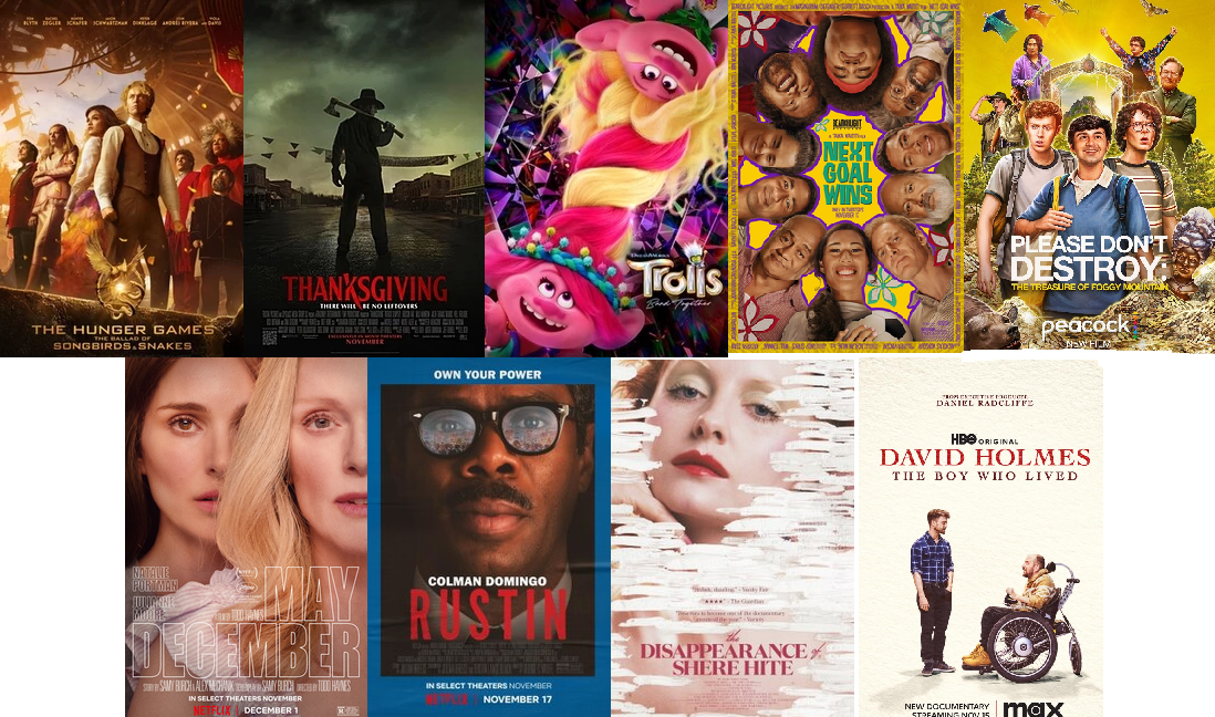 Erik Childress and Steve Prokopy have nine new reviews on this episode. They include documentaries about the tragedy of a Harry Potter stunt double (David Holmes: The Boy Who Lived) and another about a forgotten woman’s sexuality activist (The Disappearance of Shere Hite). There’s a feature about the unsung architect of the March on Washington (Rustin) and another from Taika Waititi about the World Cup team that lost 31-0 (Next Goal Wins). The comedy trio from Saturday Night Live craft their first feature (Please Don't Destroy: The Treasure of Foggy Mountain), Eli Roth crafts a feature out of his Grindhouse trailer (Thanksgiving) and The fuzzy-haired musical creatures are back for their third film (Trolls Band Together). Todd Haynes, Natalie Portman and Julianne Moore team up for a squirmy tale ripped from the tabloids (May December) and may the odds be ever in your favor for a new franchise prequel (The Hunger Games: The Ballad of Songbirds and Snakes).