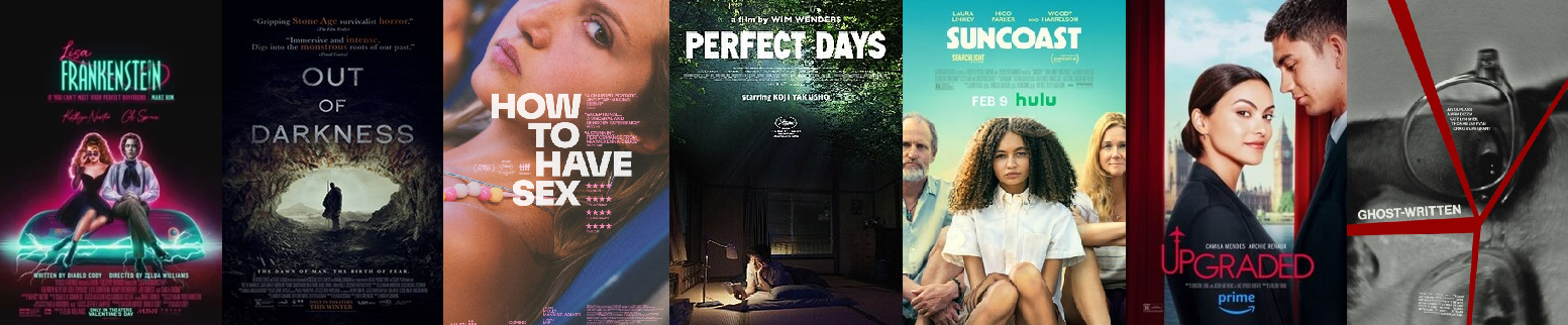 Seven new films get reviews from Erik Childress and Steve Prokopy this week. They include a new mistaken identity rom-com with Camila Mendes (Upgraded) and another story of a novelist plunged into a murderous plot (Ghostwritten). A teenage girl comes of age in the time of Terry Schiavo (Suncoast) while a trio of friends discover the harsher realities of growing up while on vacation in an award-winner from Cannes (How To Have Sex). Also for the second week in a row there is a Wim Wenders film, this time up for an Oscar (Perfect Days). A group of ancient nomads encounter an evil force (Out of Darkness) while our reviews are forced to encounter the latest and, perhaps, worst screenplay from Oscar-winner Diablo Cody (Lisa Frankenstein).