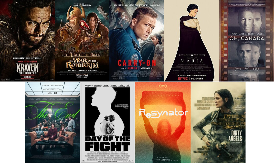 Erik Childress and Steve Prokopy continue to wade into December’s offerings with nine new films on the slate. They include the directorial debut of Jack Huston (Day of the Fight) and Eva Green leading a team of female operatives against ISIS (Dirty Angels). The director of The Act of Killing does an apocalyptic musical (The End) while the daughter of a synthesizer inventor takes a joyous and complicated journey learning about her deceased father (Resynator). Paul Schrader takes his own trip through the life of a dying Richard Gere (Oh, Canada) while Angelina Jolie takes us through that of opera’s Callas (Maria). 46 years after Ralph Bakshi, Tolkien gets animated again (The Lord of the Rings: The War of the Rohirrim) or you can stay home and watch TSA agent Taron Egerton face off against terrorist Jason Bateman in an airport (Carry On). Finally, Sony’s Spider-Man spinoff anti-hero line of Marvel movies supposedly comes to an end (Kraven the Hunter).