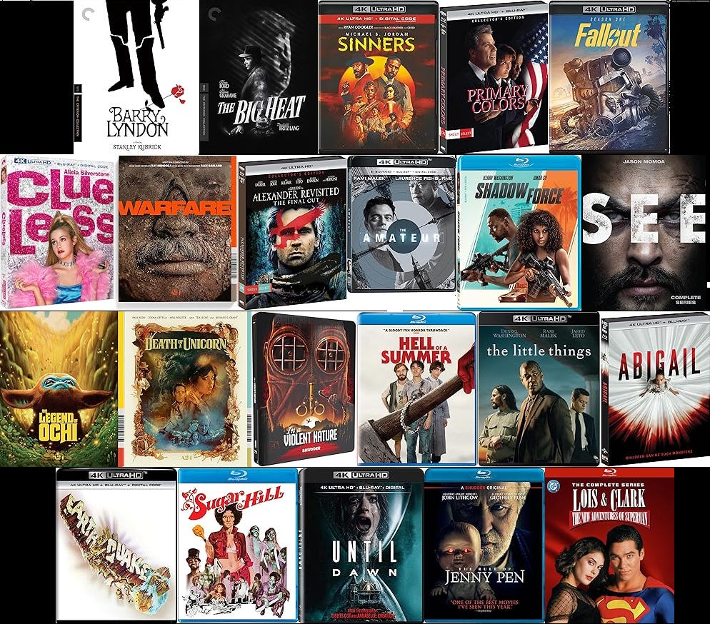 1:44:51 - New Theatrical & TV Titles On Blu-ray (Warfare (4K), Death of a Unicorn, The Amateur (4K), The Legend of Ochi, , Shadow Force, The Rule of Jenny Pen, Hell of a Summer, Until Dawn (4K), Sinners (4K), Fallout: Season One (4K), Lois & Clark: The New Adventures of Superman (1993-1997), See (The Complete Series))