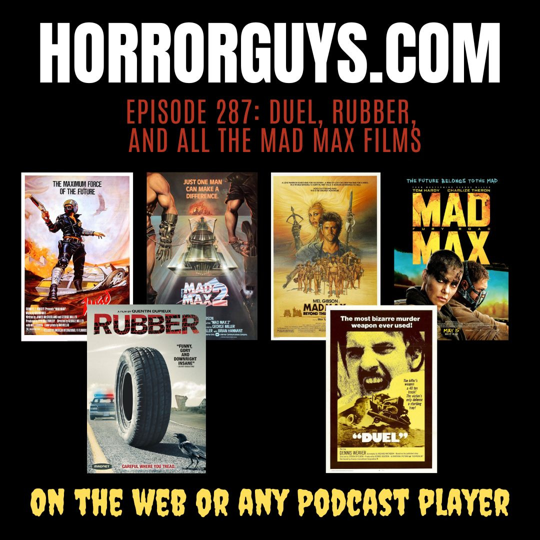 It’s Road Kill Week here with the Horror Guys. The rubber hits the road with “Mad Max” from 1979, “Mad Max 2: The Road Warrior” from 1981, and “Max Max: Beyond Thunderdome” from 1985. We wait about thirty years for the next installment, “Mad Max: Fury Road” from 2015. Then we’ll go back and see the movie that influenced the whole thing, “Duel” from 1971. Just for laughs, we’ll also take a look at “Rubber” from 2010.