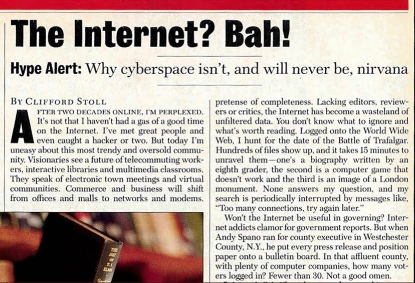 Back in the 90s, the Internet was mostly used by normal people only for email. Still, there were true believers that thought that the Internet could one day change the way people worked. At the time, they were mostly mocked. Here’s an article from Newsweek back in 1995.