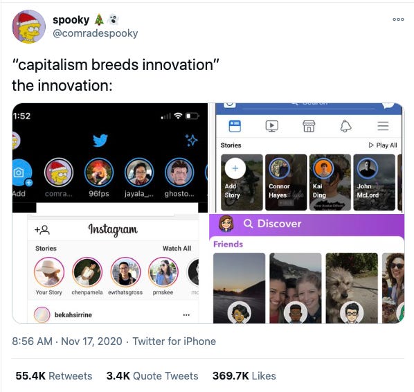 People are understandably pretty annoyed by every social media app copying one another. But some extreme left-wingers on Twitter are using it as an opportunity to attack capitalism. Here’s a Tweet I saw earlier this week.