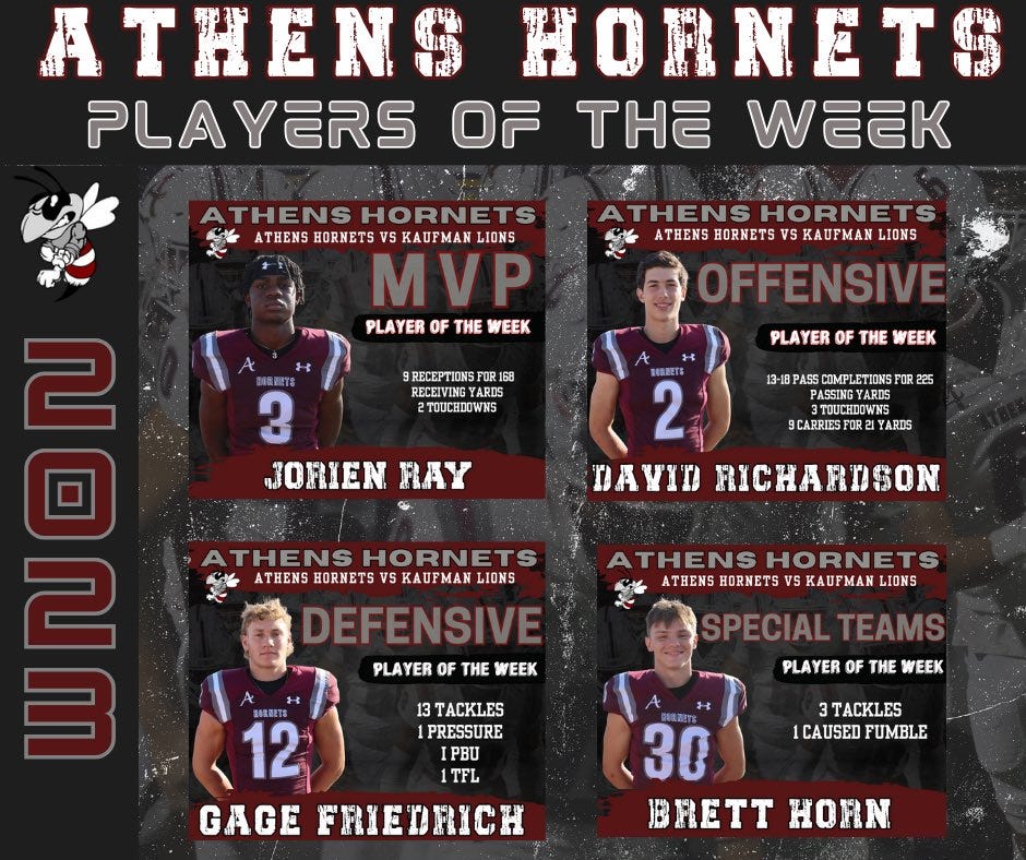 The Athens Hornets (3-1) are riding a three-game winning streak as they prepare to start District 9-4A play this Friday night by hosting the Jacksonville Indians.