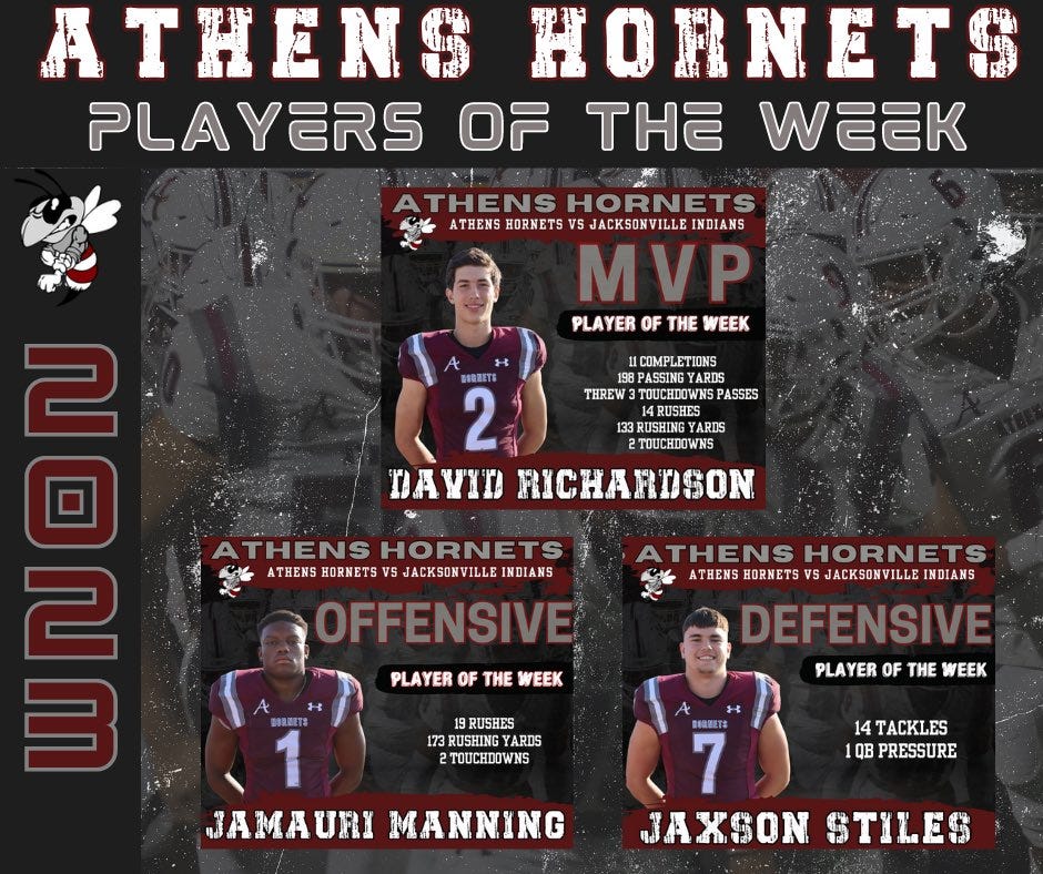 The Athens Hornets (4-1) are on a four-game winning streak after beating Jacksonville last week, 48-28, to open district play. The Hornets have been playing well in all three phases -- offense, defense, and special teams -- and continue to improve each week as we hit the midway mark of the regular season.
