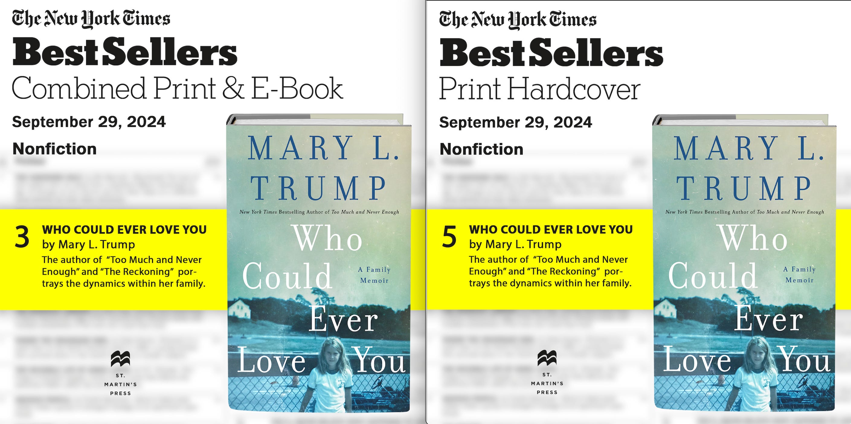 I'm so grateful for all of the support I’ve received, and to everybody who's bought a copy of the book. It's very important to me that people understand that this is not a political book; this is not a book about Donald Trump. Unlike my first book, Too Much and Never Enough, which I consider a psychological history of a family, Who Could Ever Love You is a memoir about my family of origin. Obviously, my experiences as a Trump inform who Donald became as well, but I wanted to focus on my dad and the ways in which his experiences as the oldest son and namesake shaped his relationship with his father and siblings while also examining how my experience of growing up as the child of my parents shaped me.