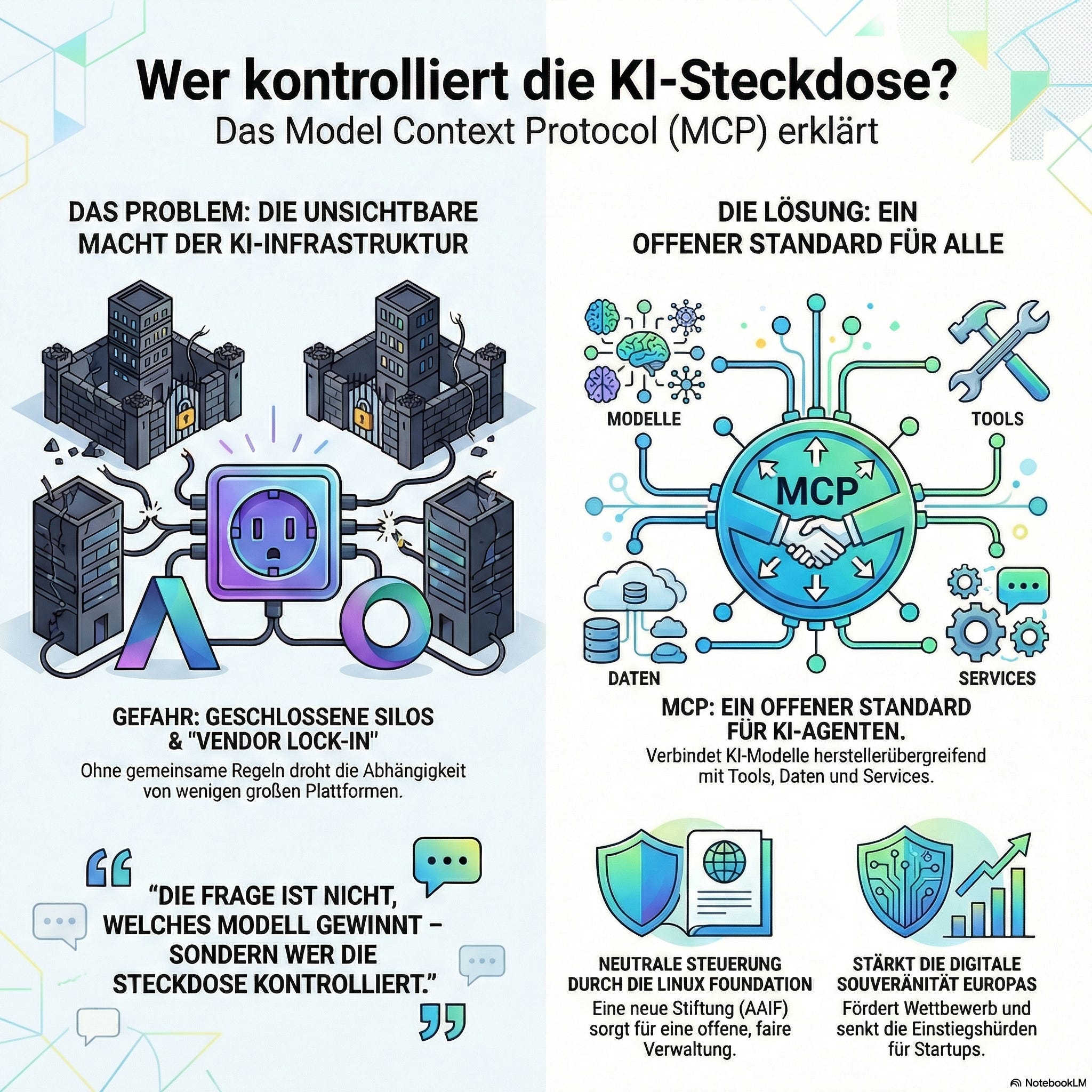 Agentische KI braucht gemeinsame Regeln. Ohne offene Standards drohen geschlossene Silos und Abhängigkeiten. MCP verschiebt die Macht von Plattformen hin zu offenen Ökosystemen.