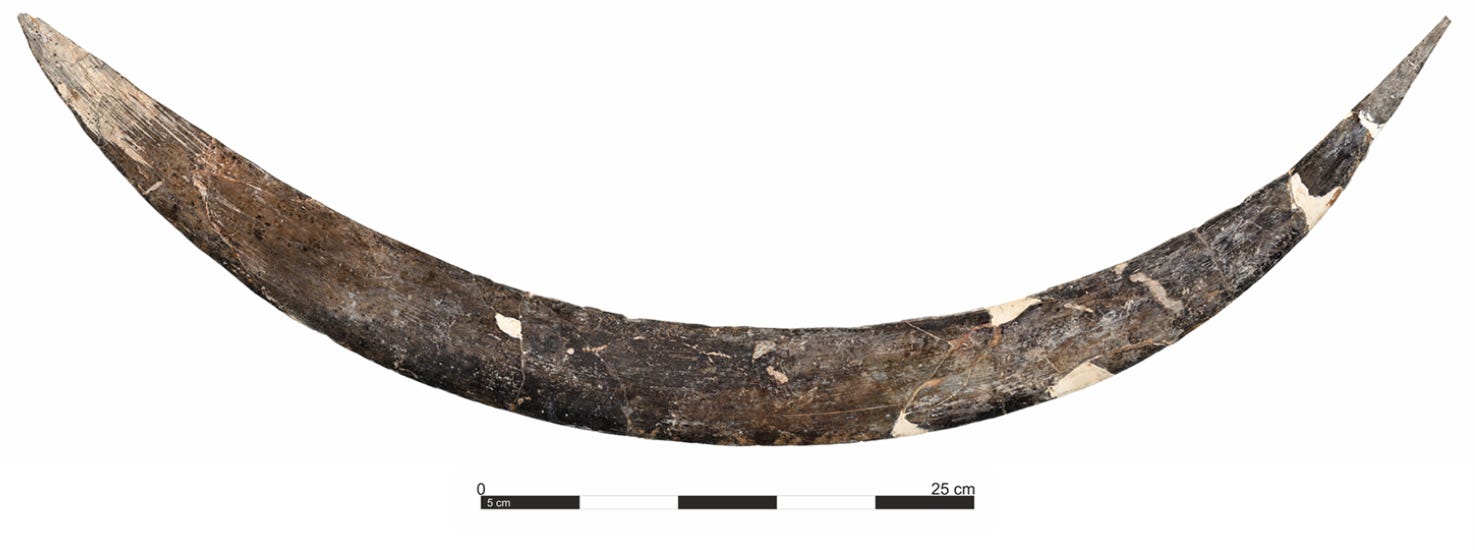Working mammoth ivory is no small feat. Unlike wood or bone, it requires intensive labor to cut, shave, and shape. Tusks from female mammoths could reach 9 centimeters in diameter; males twice that. To sculpt a thin aerodynamic boomerang from such material meant removing massive quantities of ivory, smoothing it into a flight-worthy arc, and engraving it with deliberate care.
