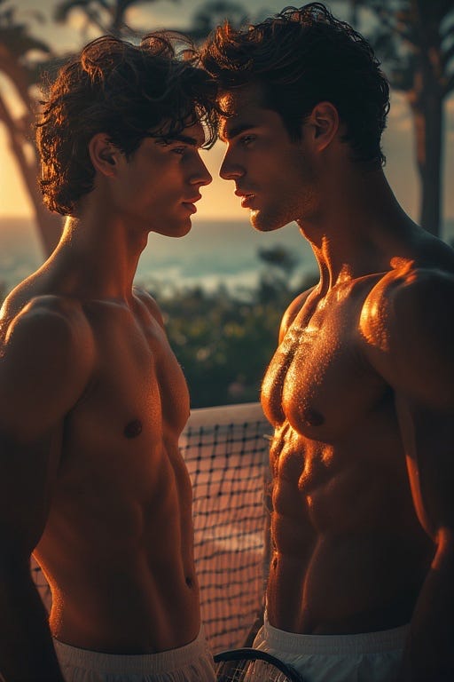 Wiles rounded the far corner of the court with his racket bag slung over one shoulder, hair still damp like he’d just showered, eyes catching mine immediately—like he’d been looking for me too. For a split second, I pictured him naked in that same shower, water sliding down his chest, and felt a sharp tingle in my shorts that made me shift where I stood.