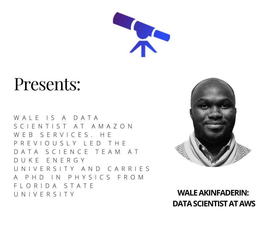 We invited Wale Akinfaderin to an informal chat. Wale is a data scientist at Amazon Web Services. He was previously the lead data scientist at Duke Energy Corporation and holds a PhD in Physics from Florida State University. We invited some users on our platform and other guests to join the chat, adding more diversity in the line of questioning to make it a more interesting chat. We touched on multiple topics ranging from understanding the difference between different ‘careers’ within data science, changing expectations as one transitions from junior to intermediate to senior and some of the interesting projects he works on outside of his work.