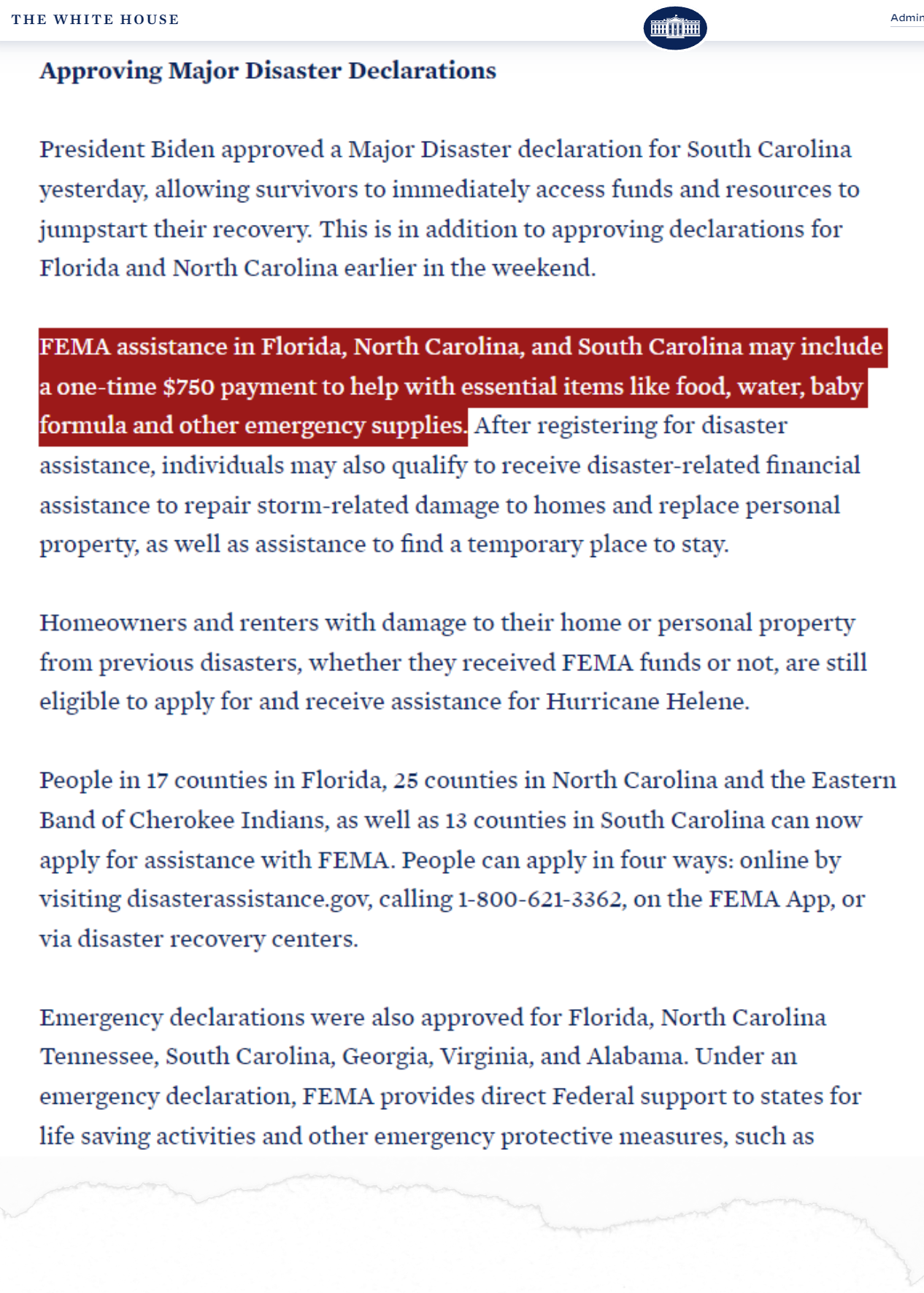 “FEMA assistance in Florida, North Carolina, and South Carolina may include a one-time $750 payment to help with essential items like food, water, baby formula and other emergency supplies…”
