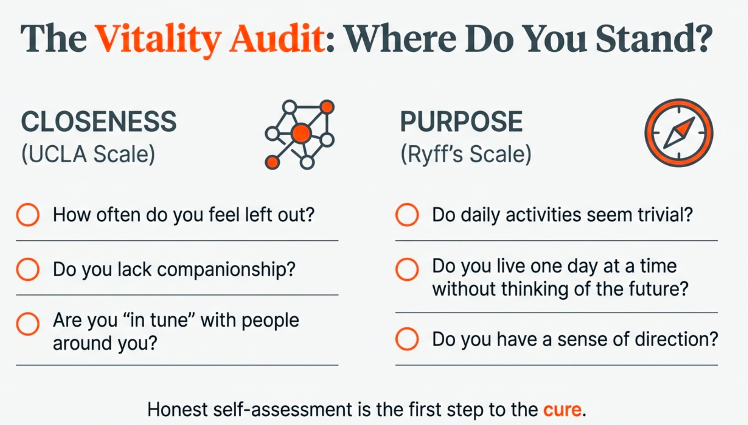 Purpose and closeness are biologically linked drivers of vitality.Research involving over 8,000 people shows that a strong sense of purpose explains much of the relationship between loneliness and mortality, reinforcing that vitality cannot be optimized in isolation.