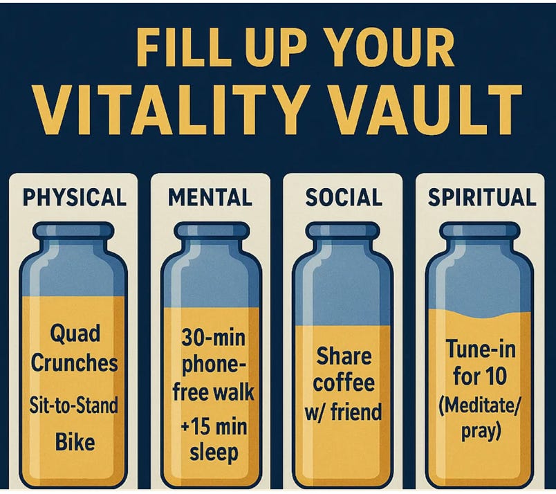 * These small, repeatable “deposits” build buffers against physical crises, mental storms, social heartbreak and spiritual reckoning—so you can “Dare to Be Vital” when life tests you.