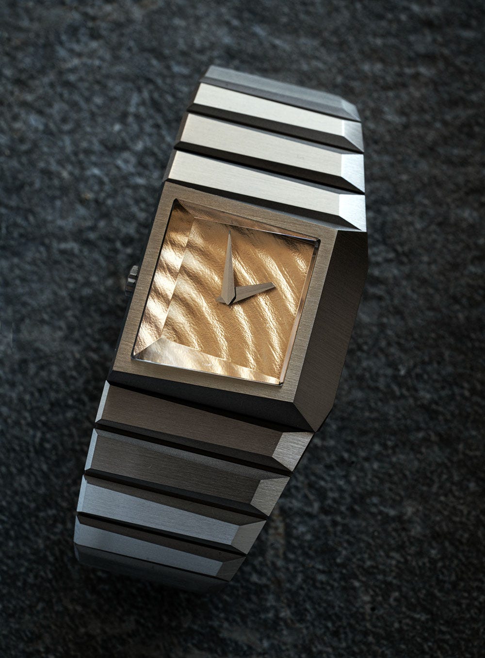 The case and bracelet of the b1.3r is now in titanium, and it’s been slightly shrunk down compared to previous releases. The main feature of this watch is the solid-gold “ripple” dial, meant to look like ripples on the water (very Grand Seiko).