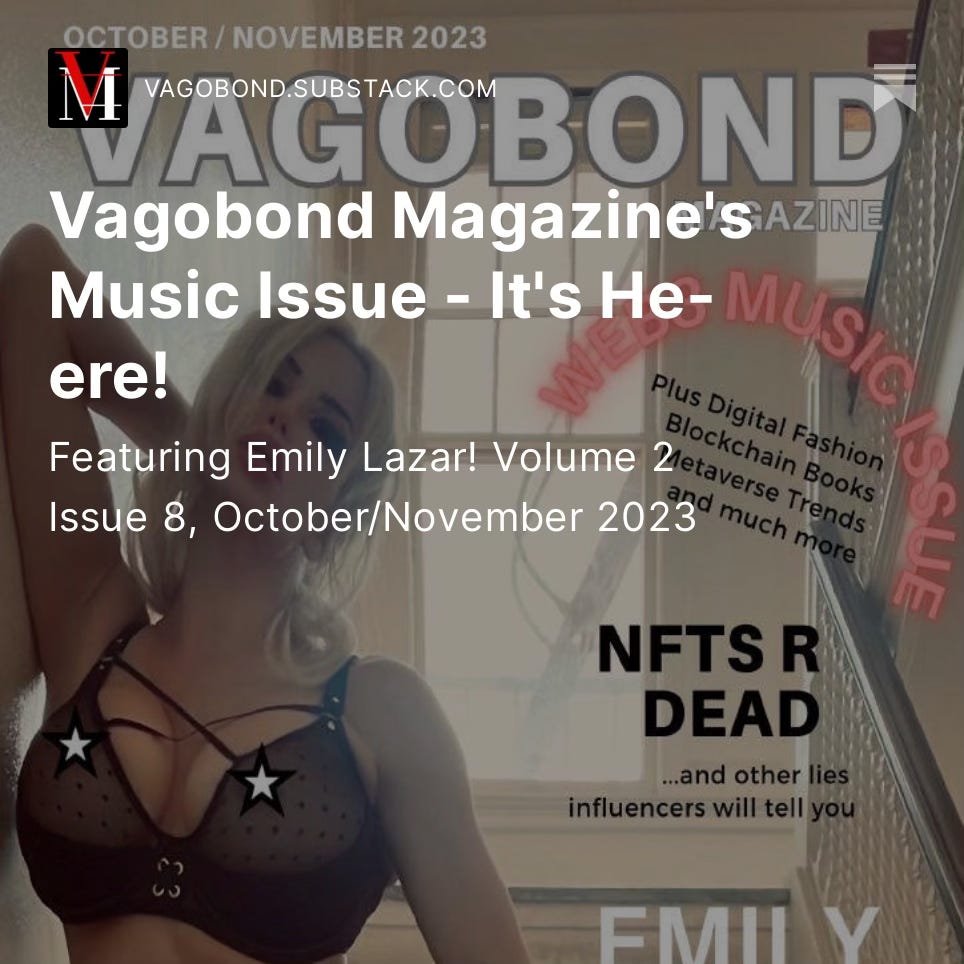 Emily Lazar joins the editors of Vagobond Magazine to talk web3, storytelling, fashion, and rock & roll. A look at the new October/November 2023 issue of VM
