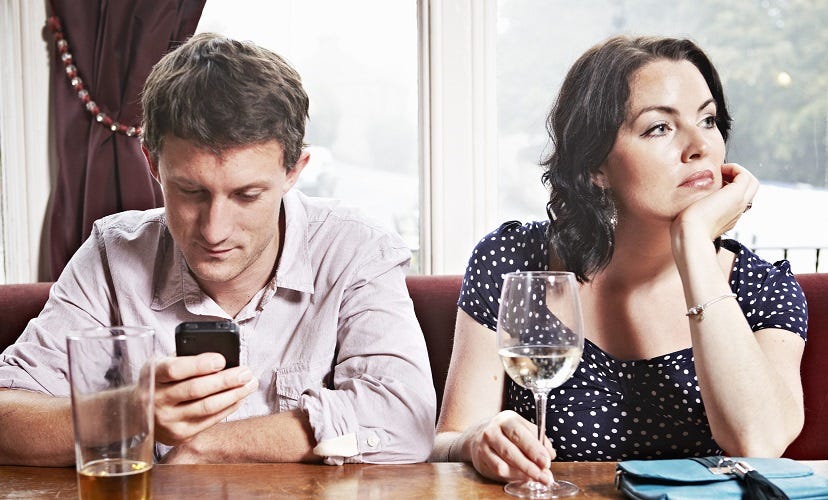 The old cliché of the man sitting at the dinner table with a newspaper up to his face has been replaced with the couple sitting in a restaurant scrolling their cell phones.