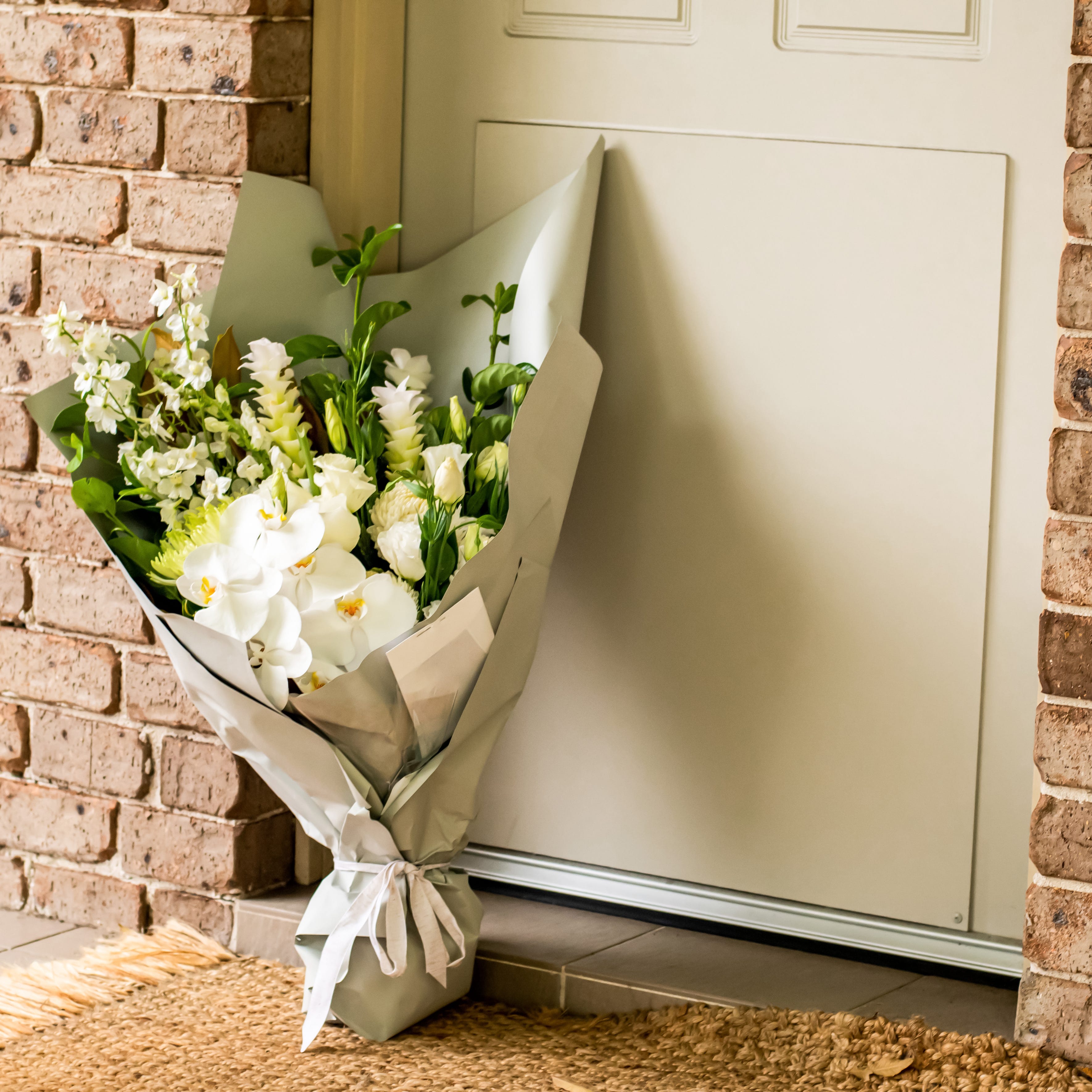 A bunch of white roses lay against the doormat. They had been bound together with a clear, two-inch-high band of tape which had a faint floral design. They were also fairly uniform in shape and size, so, definitely purchased–but from where? A grocery store with a flower department? A farmers’ market, maybe, or a big-box store?