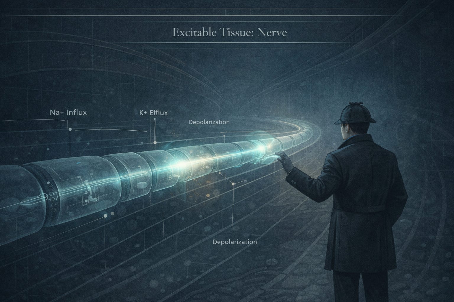 In this episode, Medlock Holmes examines excitable nerve tissue—the physiological basis of rapid signalling. We explore how neurons generate resting membrane potentials, how action potentials are triggered and propagated, and how ionic gradients store energy as information. Rather than treating electricity as a metaphor, we treat it as what it truly is in physiology: controlled charge movement governed by membrane architecture.