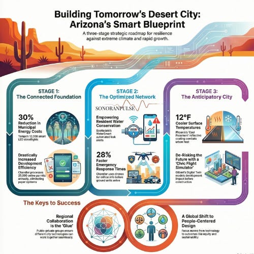 So how do you build a resilient city where triple-digit temperatures are the norm and water is the most precious commodity? For the cities of Arizona, this isn’t a theoretical question. It’s an existential one. They are turning to "smart city" technology not as a novelty, but as a critical tool for survival and governance. In this episode, we explore how Arizona is architecting the cities of the future using a clear, three-stage evolutionary roadmap as our guide.