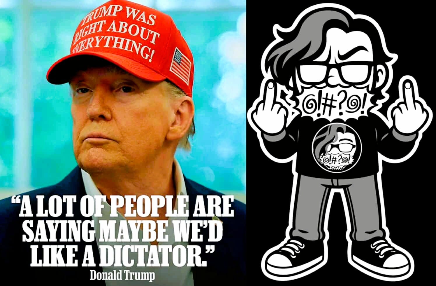 America’s Pedo-in-Chief was quoted yesterday as saying that a lot of people are saying, “Maybe we’d like a dictator.” Which is complete horseshit. He’s throwing propaganda around like it’s 1930s Nazi Germany. I’m so over this fuckery.