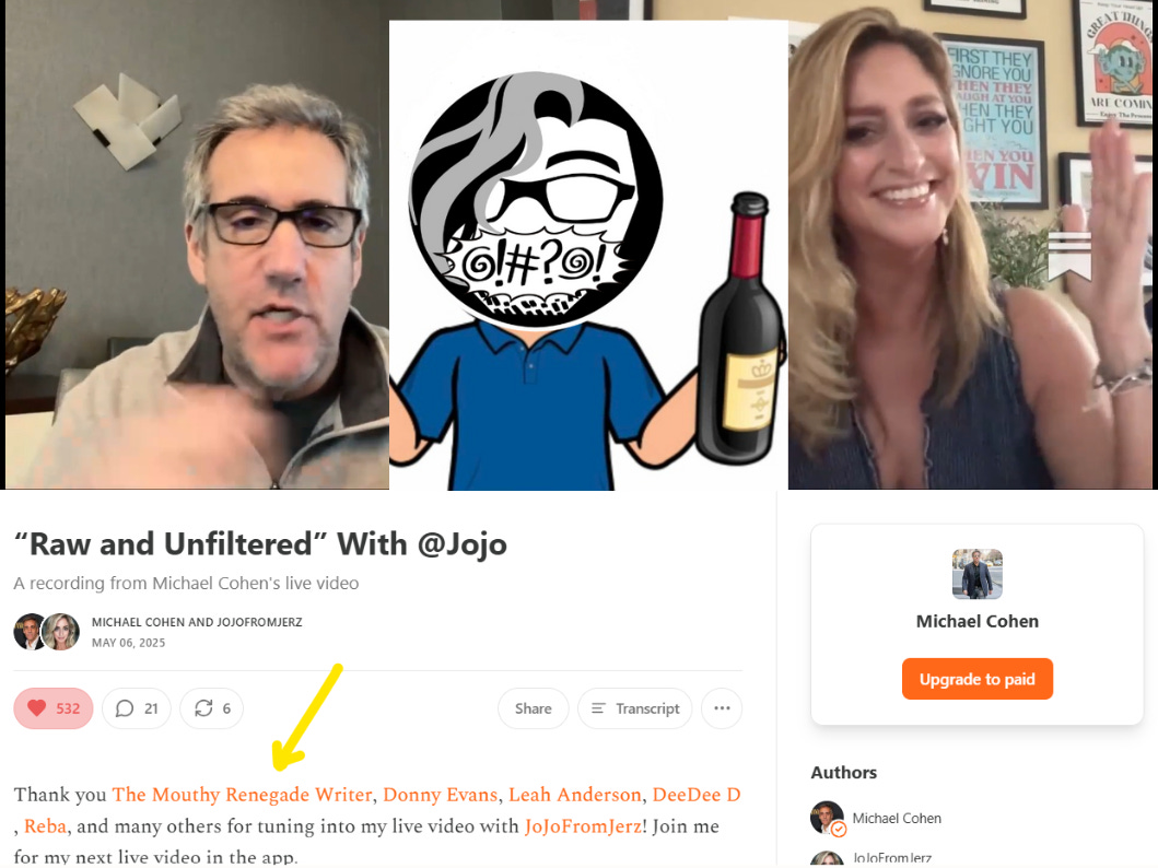I was out walking Libby the Mooch when I had an idea for today’s podcast episode. You’ll see what I mean when you give this one a listen. Then, it became even clearer when I stumbled upon my favorite political humor writer on Substack, JoJoFromJerz. She was just starting a Substack Live with none other than Trump’s former lawyer turned nemesis, Michael Cohen.
