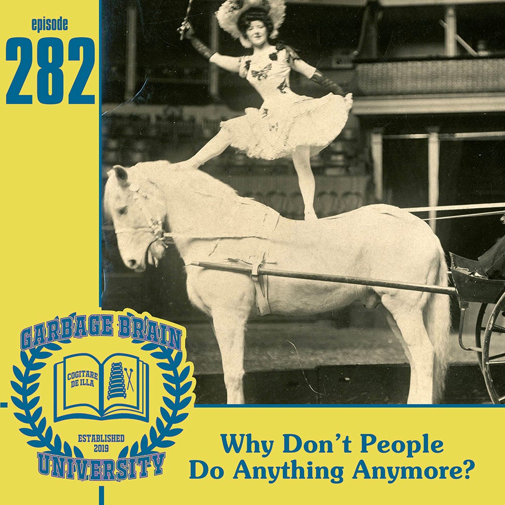 Cue the stock circus music! We dive into the history of circuses, and the history of people doing dumb things outside of the circus. On top of the very most obvious aspects of circuses, we covered cow bingo, togas, circus aesthetics, object manipulation, and the crowning question of all: Why Don’t People Do Anything Anymore?
