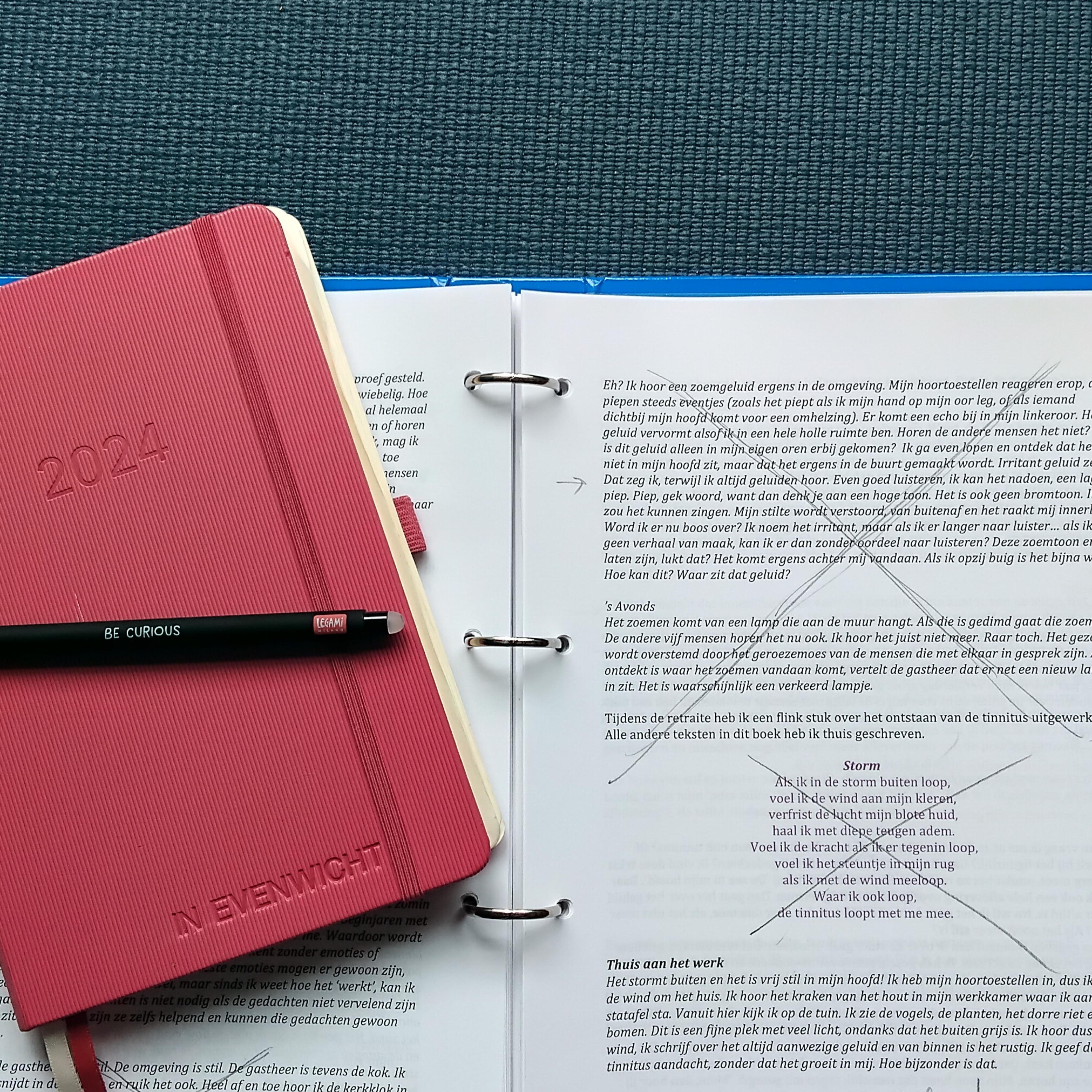 Dat was in het begin heel moeilijk, de allereerste keer met zo van: wil ik deze tekst dan wel eruit halen? Ja of nee? Dat... dat... dat heeft even geduurd en op een gegeven moment was ik zover: ja dit is een hele goede beslissing. Helemaal na de feedback van: dit is veel te veel wat je doet, dit heb je al een paar keer gezegd, dan kan het geschrapt worden. Want ik wil niet te veel herhalingen in dat boek hebben. Dus ja, schrappen dus!