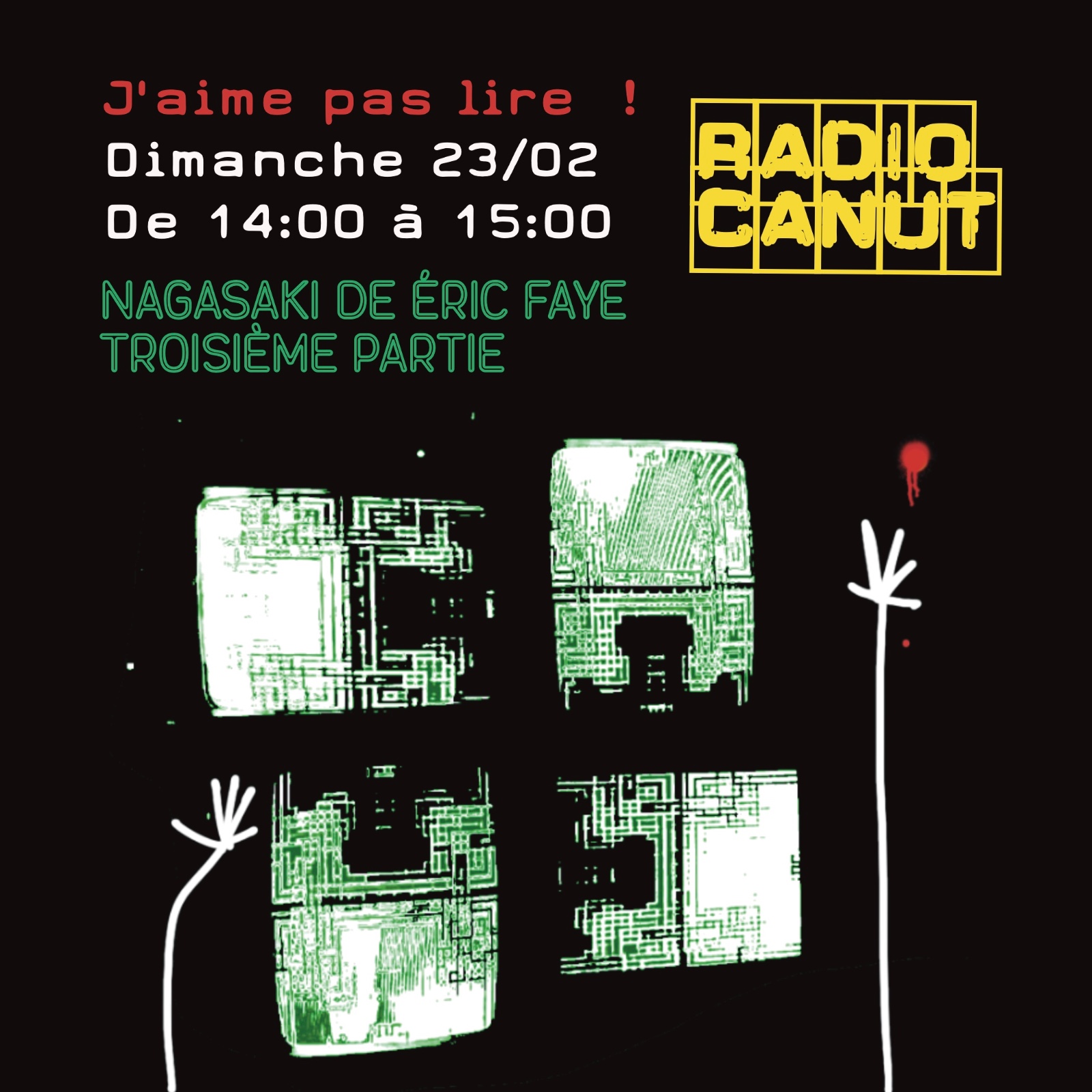 J’aime pas lire !NAGASAKI de Eric FayeLecture radiophonique sur les ondes de Radio Canut : 3e Partie00 - The Alchemist - Learned by listening01 - ETO & MIL BEATS - Front Row02 - ROBERT AARON (feat ANTHONY JOSEPH) - The saddest kiss03 - Nick Drake - Parasite04 - Willie The Kid x V Don - Stay Connected05 - Lisa Ekdahl - Plaintive Rumba