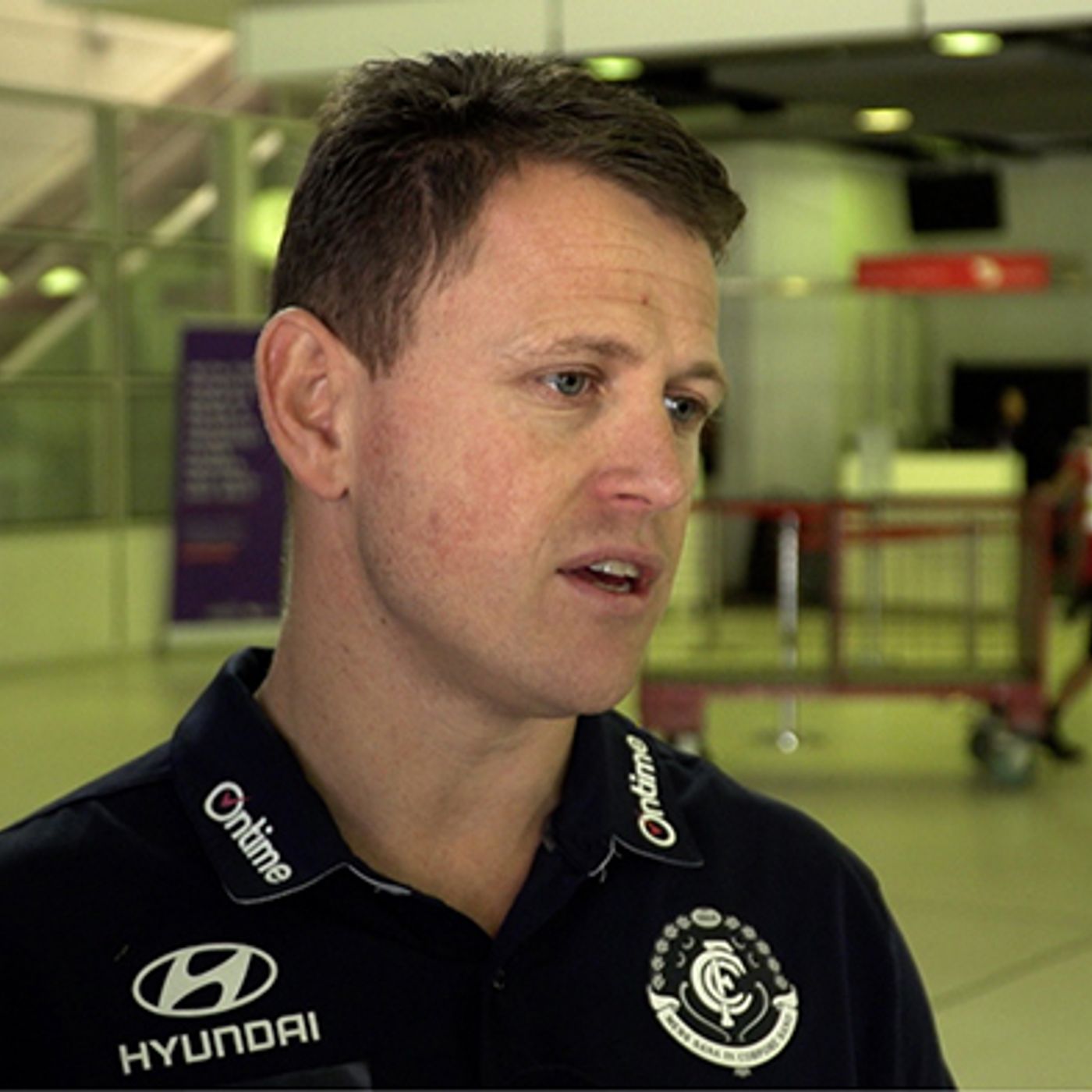 Carlton coach Brendon Bolton speaks to the media upon arrival at Brisbane Airport.